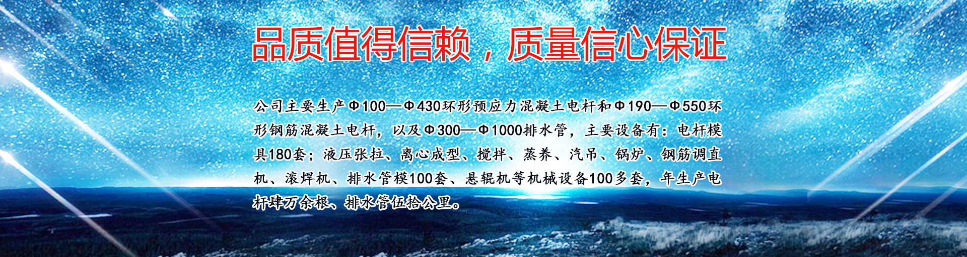 公司主要生產(chǎn)ф100—ф430環(huán)形預(yù)應(yīng)力混凝土電桿和ф190—ф550環(huán)形鋼筋混凝土電桿,以及ф300—ф1000排水管,主要設(shè)備有:電桿模具180套;液壓張拉、離心成型、攪拌、蒸養(yǎng)、汽吊、鍋爐、鋼筋調(diào)直機(jī)、滾焊機(jī)、排水管模100套、懸輥機(jī)等機(jī)械設(shè)備100多套,年生產(chǎn)電桿肆萬余根、排水管伍拾公里?!?